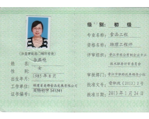 食品工程食品助理证书